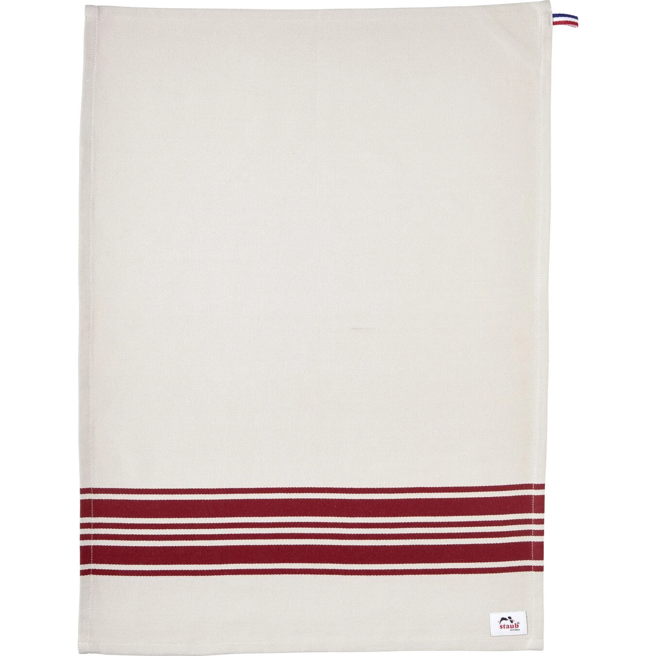 Das neue STAUB Küchenhandtuch in den Maßen 50 x 70 cm ist der perfekte Allrounder für die Küche. In bewährter STAUB Qualität erledigt es sämtliche Aufgaben, die für das hilfreiche Stofftuch vorgesehen sind mit Bravour: Trocknen, Abtrocknen, Wischen, Polieren – Kochen ohne Küchenhandtuch ist tatsächlich kaum vorstellbar. Dazu ist es aus besonders saugfähiger, reiner Baumwolle gefertigt und für lange Haltbarkeit hochwertig verarbeitet: in einer Ecke befindet sich ein fest vernähter, praktischer Aufhänger und die Säume sind auf allen vier Seiten umgeschlagen. Hervorzuheben ist auch das zeitlos-edle Design. Die warmen, karminroten Streifen bilden einen feinen Kontrast auf dem naturweißen Stoff und passen genauso gut in eine Landhausküche, wie zu einem minimalistischen Küchenkonzept oder zu einer funktionellen Profiküche. Ein dezentes Etikett mit STAUB Logo verrät den Hersteller, das kleine Fähnchen in den Farben der französischen Tricolore die Herkunft des Designs. In jedem Fall ist das STAUB Küchenhandtuch eine Bereicherung für jede Küche.