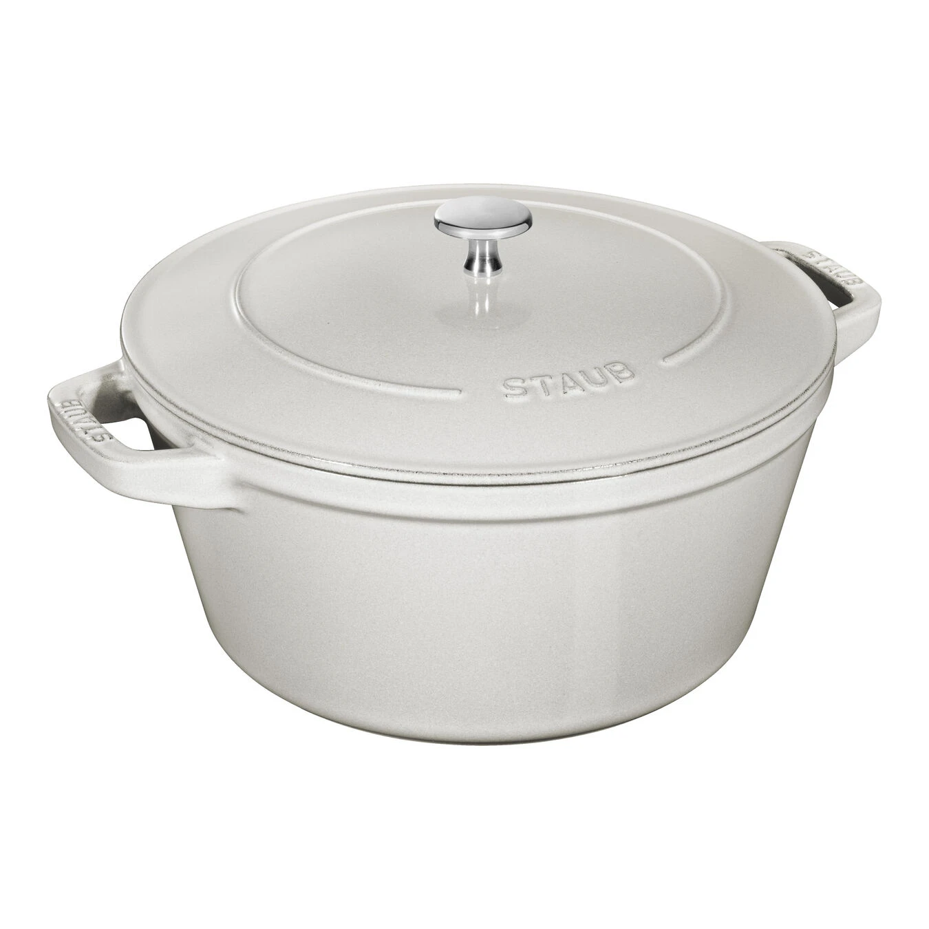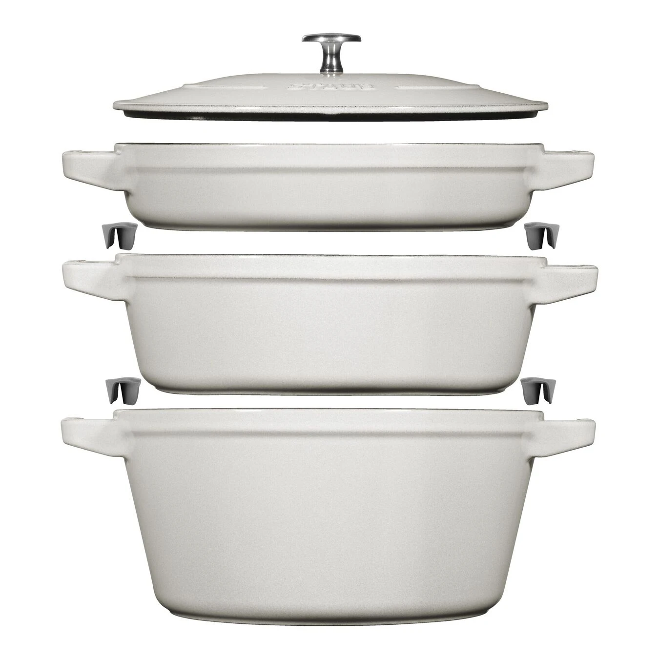 Zum Glück müssen Sie sich nicht entscheiden. STAUB hat ein Set aus Cocotte, Schmorpfanne und Pfanne mit selbsttätigem Deckel zusammengestellt, das sich leicht stapeln lässt und in jede Küche passt. Die elegante Farbe Weißer Trüffel, benannt nach der exklusiven Zutat, die französische Köche lieben, macht die Gusseisenprodukte zu einem Highlight auf dem Tisch, wo sie die Speisen lange warm halten.