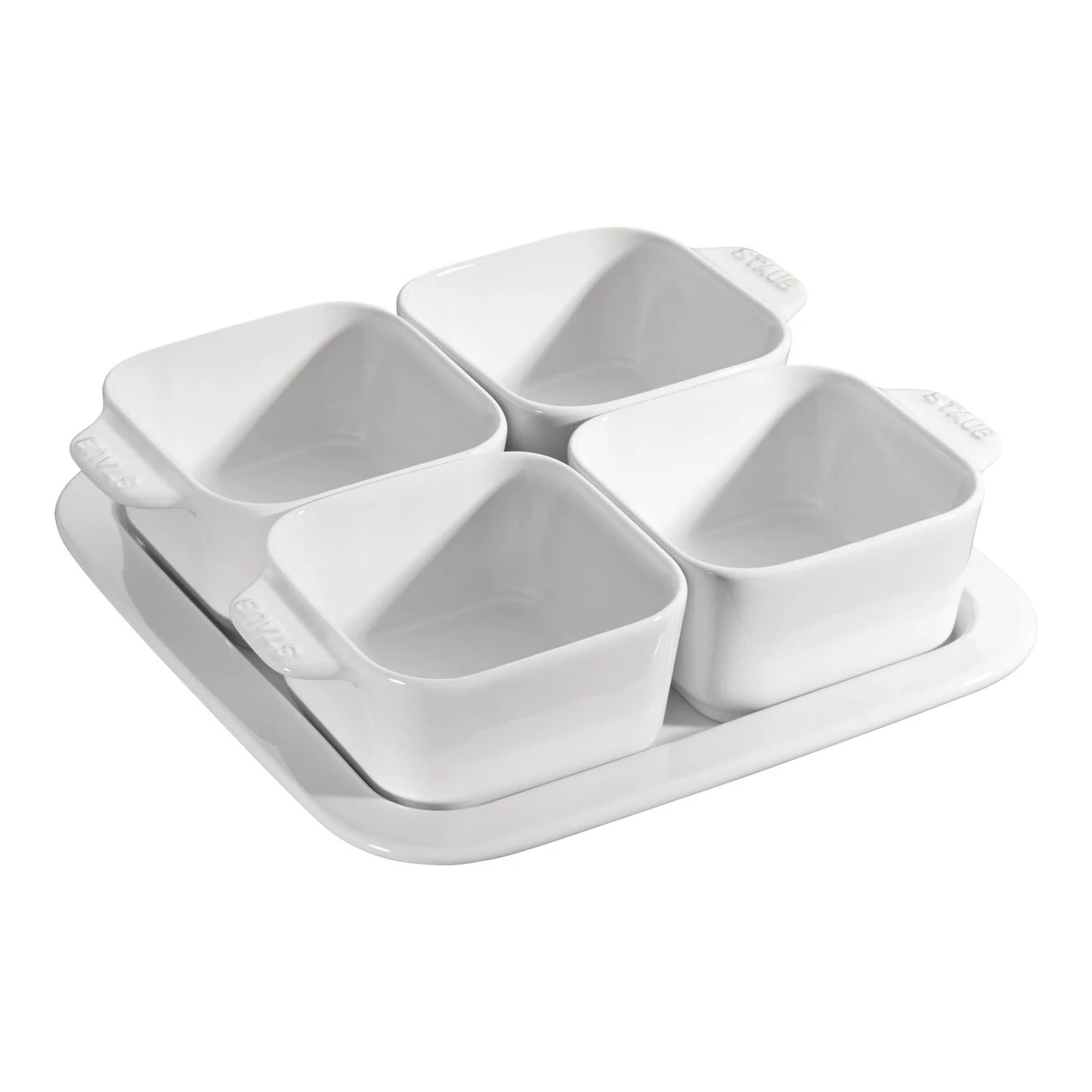 Mit dem Tapas-Set aus der Serie Keramik servieren Sie Ihren Gästen mediterrane Tapas und andere kleine Snacks. Das Set eignet sich hervorragend für Feste im kleinen Rahmen, bei denen Sie nicht auf eine ansprechende Dekoration verzichten möchten. Das Tapas-Set hat einen Teller mit den Maßen 19 x 19 cm zur Basis. Dieser enthält vier kleine Schalen mit einer Größe von jeweils 8 cm, in denen Sie die kleinen Häppchen präsentieren können. Mit dem Tapas-Set von Staub reichen Sie Ihren Freunden kleine Spezialitäten besonders stilecht.